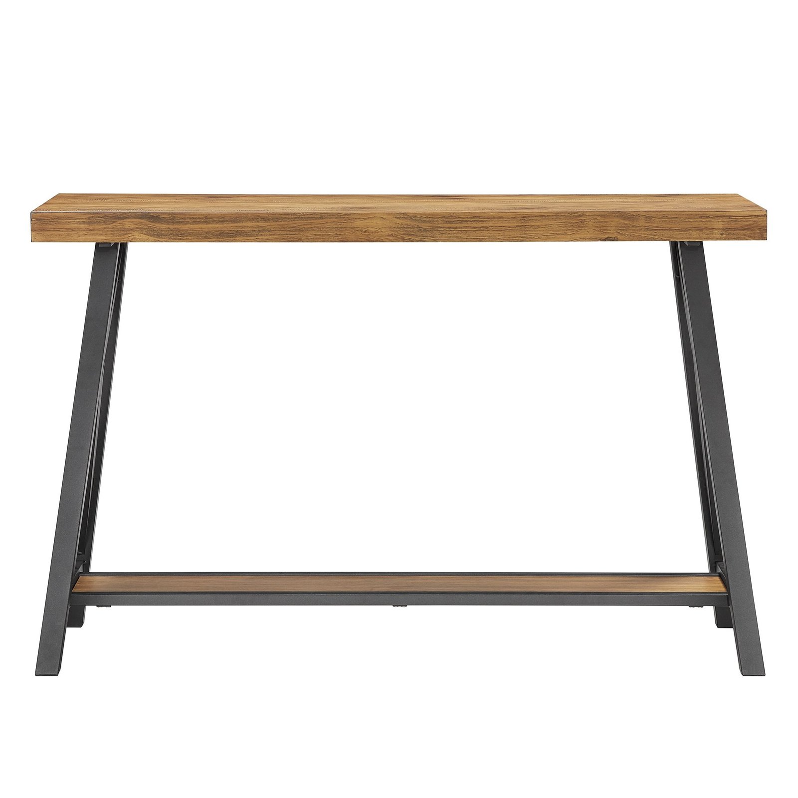 Give your family room, living room foyer, entryway, or hallway an industrial touch with this sofa table from TeakLab. Featuring and X design base, a dark finish and a rustic wood grain finish, this sofa table will complement any transitional, modern, or contemporary decor. With a lower shelf, you’ll have extra space for books or decorative items. Available in teak wood finishes.