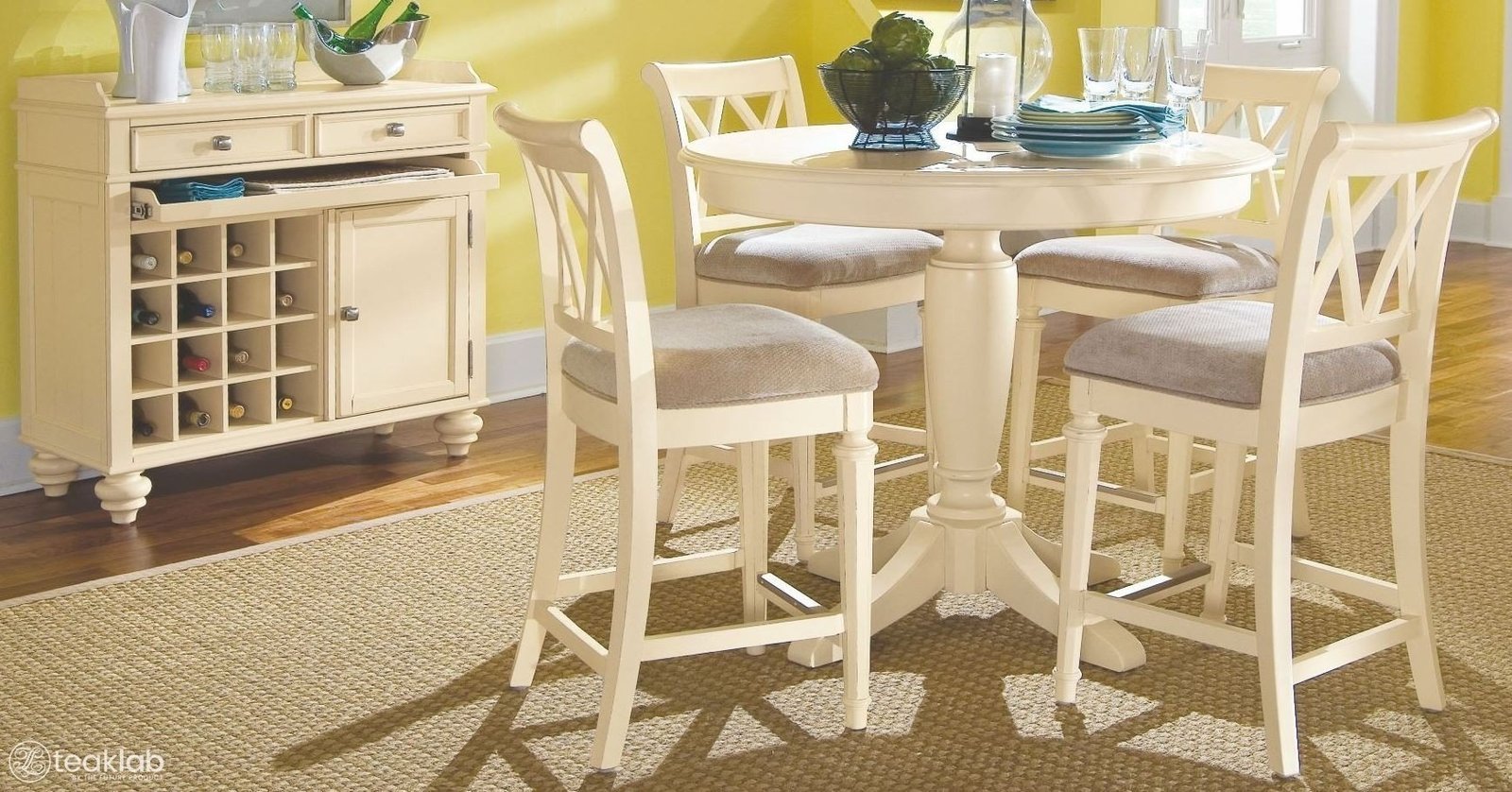 No need to buy in pieces, this Teak Wood Round 5 Piece Pedestal Pub Table Set will save you time and money! This set includes a table and 4 bar stools.